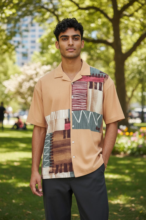 Oversized Popcorn Shirt – Orange Abstract Print | 100% Pure Cotton, Textured, Breathable Comfort